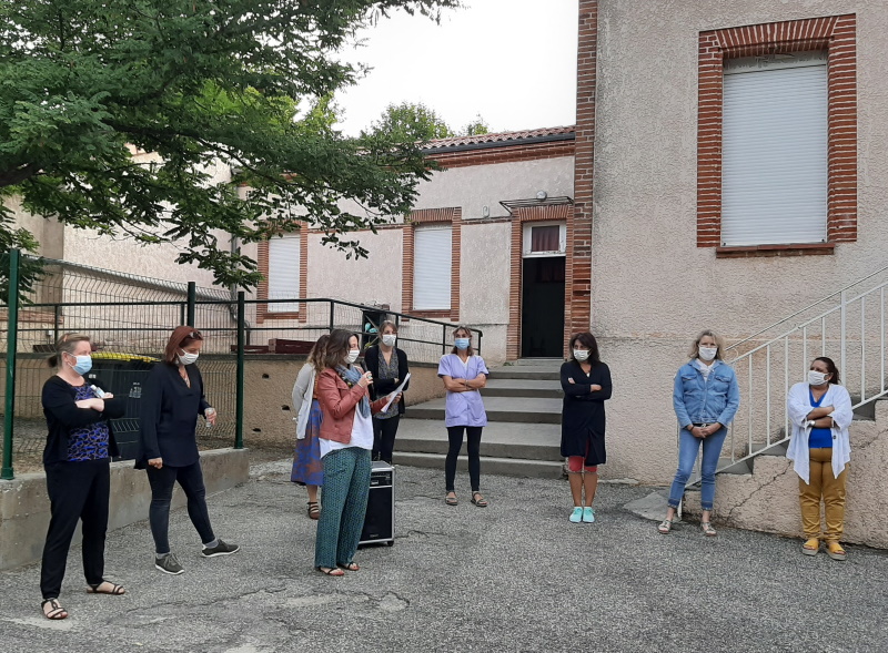 Des distributeurs de gel hydroalcoolique étaient disposés par la Mairie au portail d'entrée.