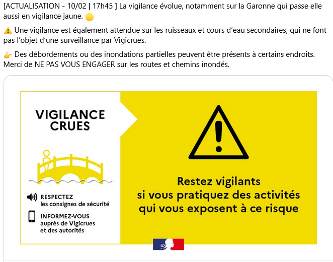 COMMUNIQUE N°1 : Le 10/02/2026 : La Préfecture de Tarn & Garonne a placé la Garonne en vigilance jaune pour crue, en raison des fortes précipitations.
